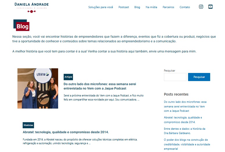 “Nesse blog tem um pouco sobre a minha trajetória profissional e soluções que ofereço para potencializar seu negócio. Ele era uma das metas de planejamento da campanha 30 anos divulgando negócios e conectando pessoas. É mais um canal de divulgação onde trago as histórias dos empreendedores que participam da revista digital da Utilità, artigos e dicas sobre empreendedorismo e comunicação, eventos que eu produzi ou fui fazer cobertura e negócios que eu tive a oportunidade de conhecer”, ressalta Daniela Andrade.