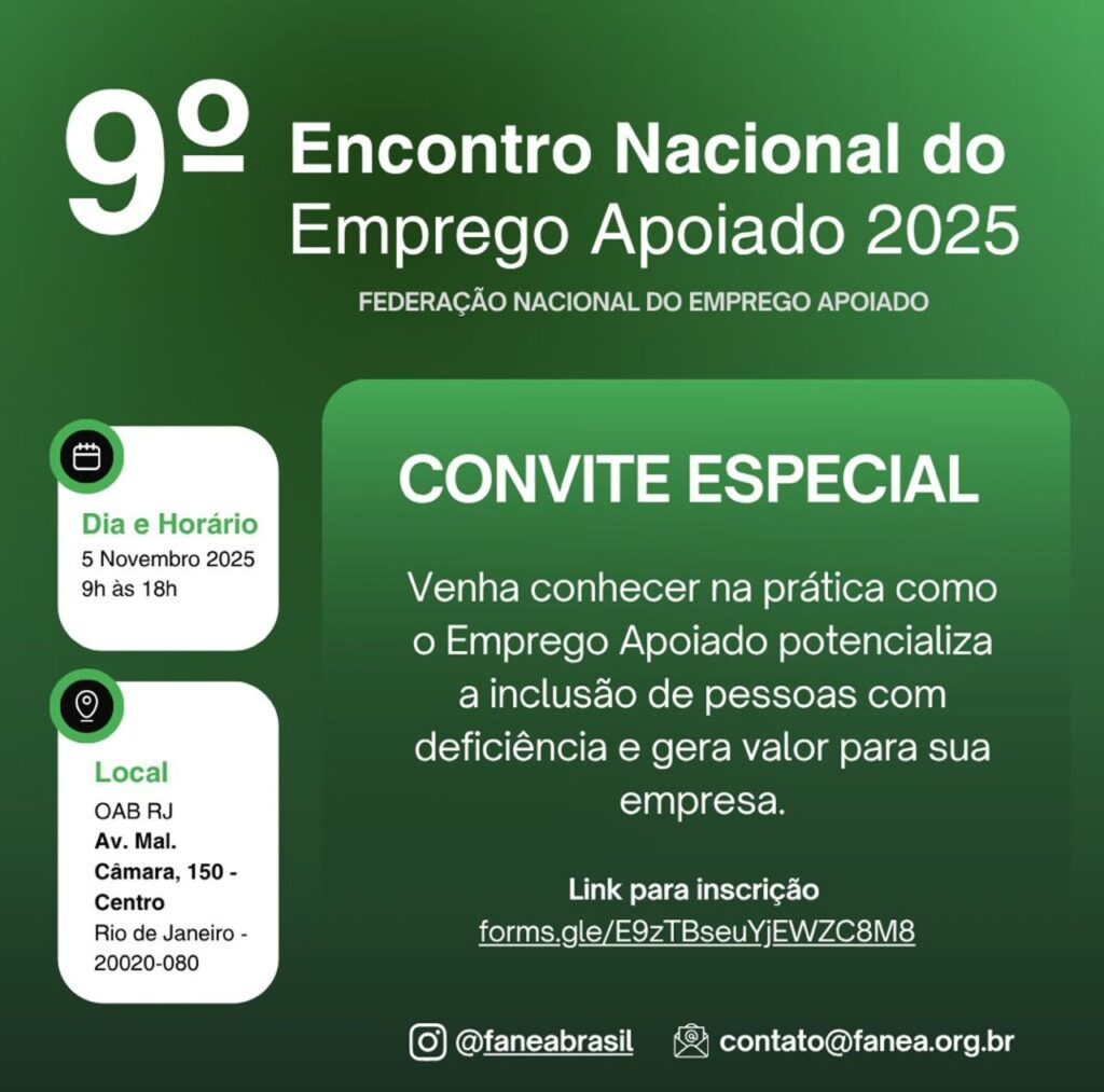 Estão abertas as inscrições gratuitas para o 9º Encontro Nacional do Emprego Apoiado, que será realizado no dia 5/11 (quarta-feira), das 9h às 18h, na sede da OAB, no centro do Rio. Organizado pela Federação Nacional do Emprego Apoiado (FANEA) e pela Diretoria da Pessoa com Deficiência da OAB-RJ, o encontro promete ser um espaço de diálogo e troca entre pessoas com deficiência, familiares, empresas, especialistas, setor público e terceiro setor.
