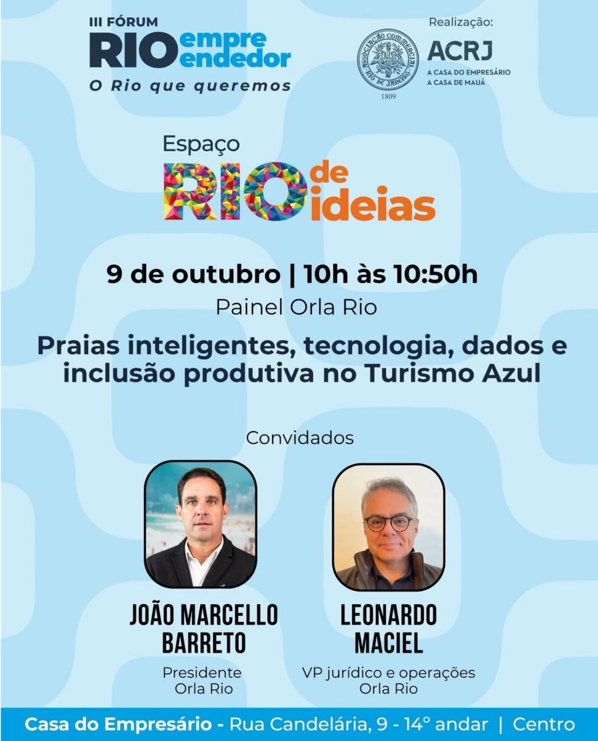 No dia 9 de outubro, a Orla Rio participou do painel “Praias inteligentes: tecnologia, dados e inclusão produtiva no Turismo Azul”, realizado no Espaço Rio de Ideias, na Casa do Empresário – ACRJ, no Centro do Rio.