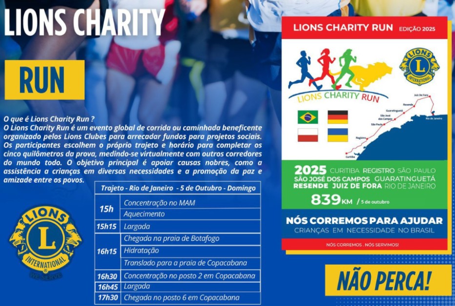 A edição brasileira do LCR passará por Curitiba, Registro, São José dos Campos, Guaratinguetá, São Paulo, Juiz de Fora e Resende, reunindo voluntários, atletas e lideranças comunitárias que correm com um propósito maior: ajudar quem mais precisa. O ponto alto do evento acontece no dia 5 de outubro, em Copacabana, no Rio de Janeiro, onde os corredores cruzarão a orla mais famosa do país para marcar o encerramento da jornada solidária. O cenário carioca, símbolo internacional do Brasil, dará ainda mais visibilidade ao lema do Lions: “Nós corremos para ajudar”.